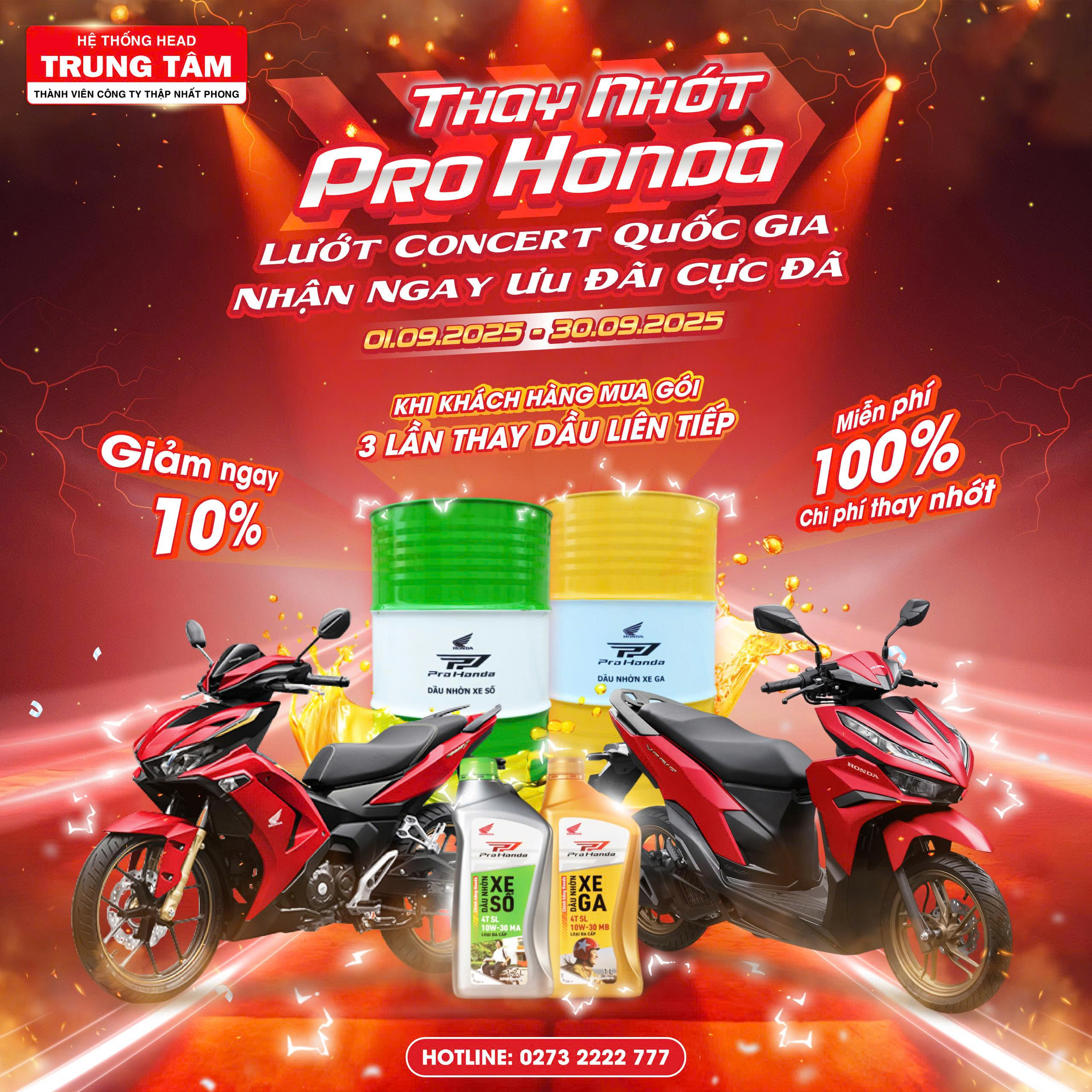 - Miễn phí 100% chi phí thay dầu Pro Honda.