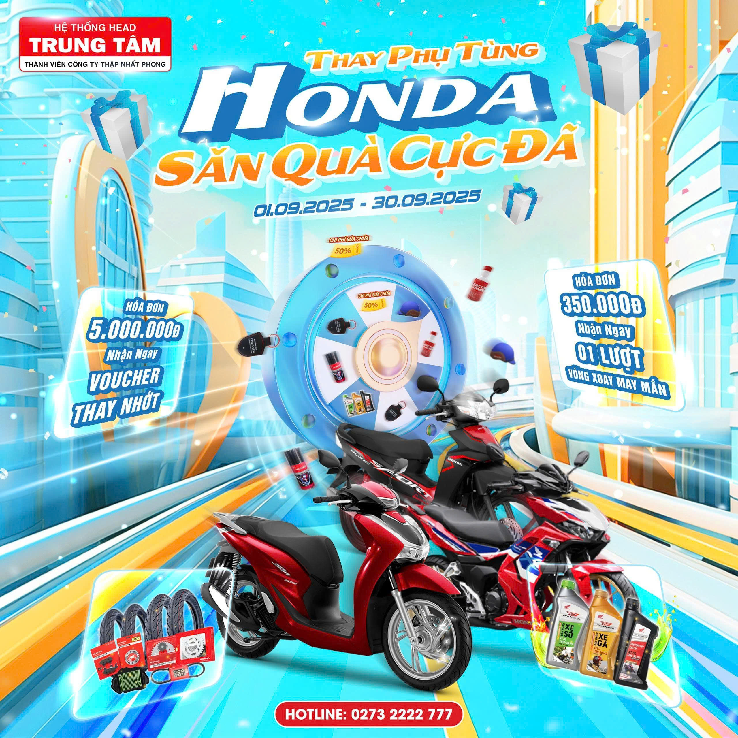 HEAD Trung Tâm thông báo chương trình khuyến mãi ưu đãi khi đến làm dịch vụ sửa chữa, thay thế phụ tùng xe máy Honda. Khách hàng sẽ có ngay cơ hội nhận những phần quà vô cùng hấp dẫn được triển khai cụ thể như sau:
